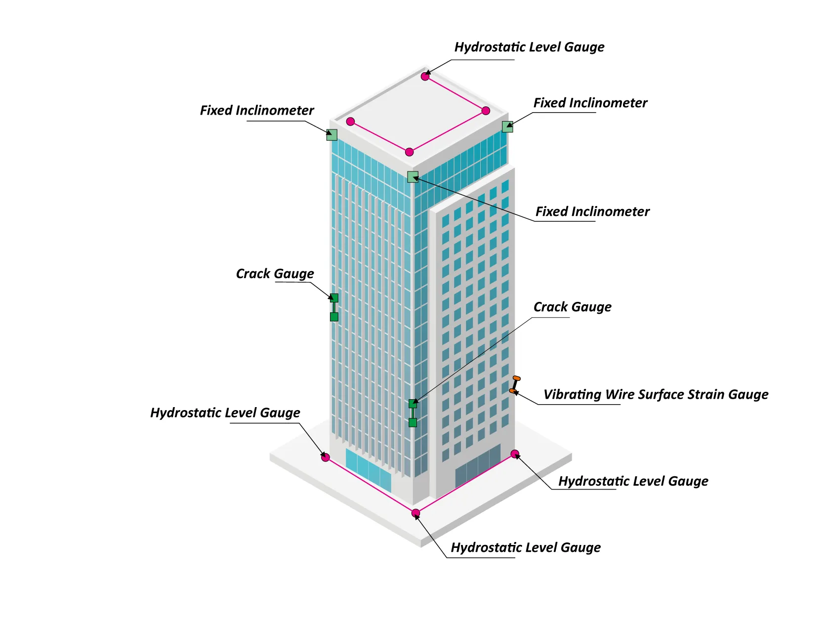 संरचनात्मक निपटान, संरचनात्मक दरार, संरचनात्मक तनाव, संरचनात्मक झुकाव की निगरानी, आदि।